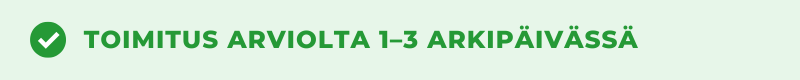 Toimitamme kaikki tilaukset nopeasti Suomen varastostamme, yleensä 1–3 arkipäivän kuluessa. Mikäli tuotteen kohdalla ei ole erikseen mainintaa tilaustuotteesta tai ulkoisesta varastosta, toimitus tapahtuu suoraan varastoltamme.